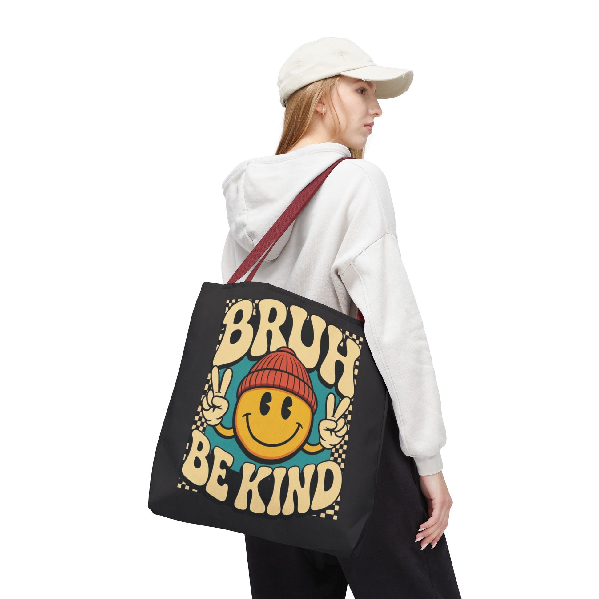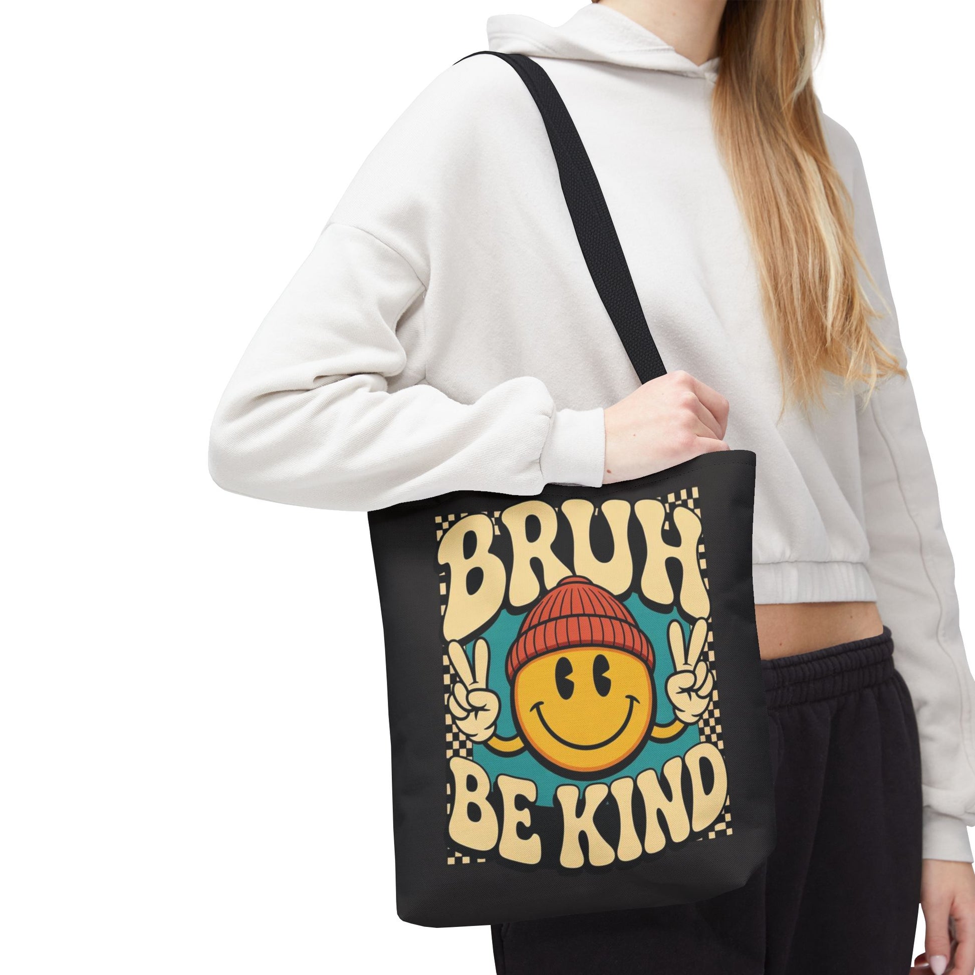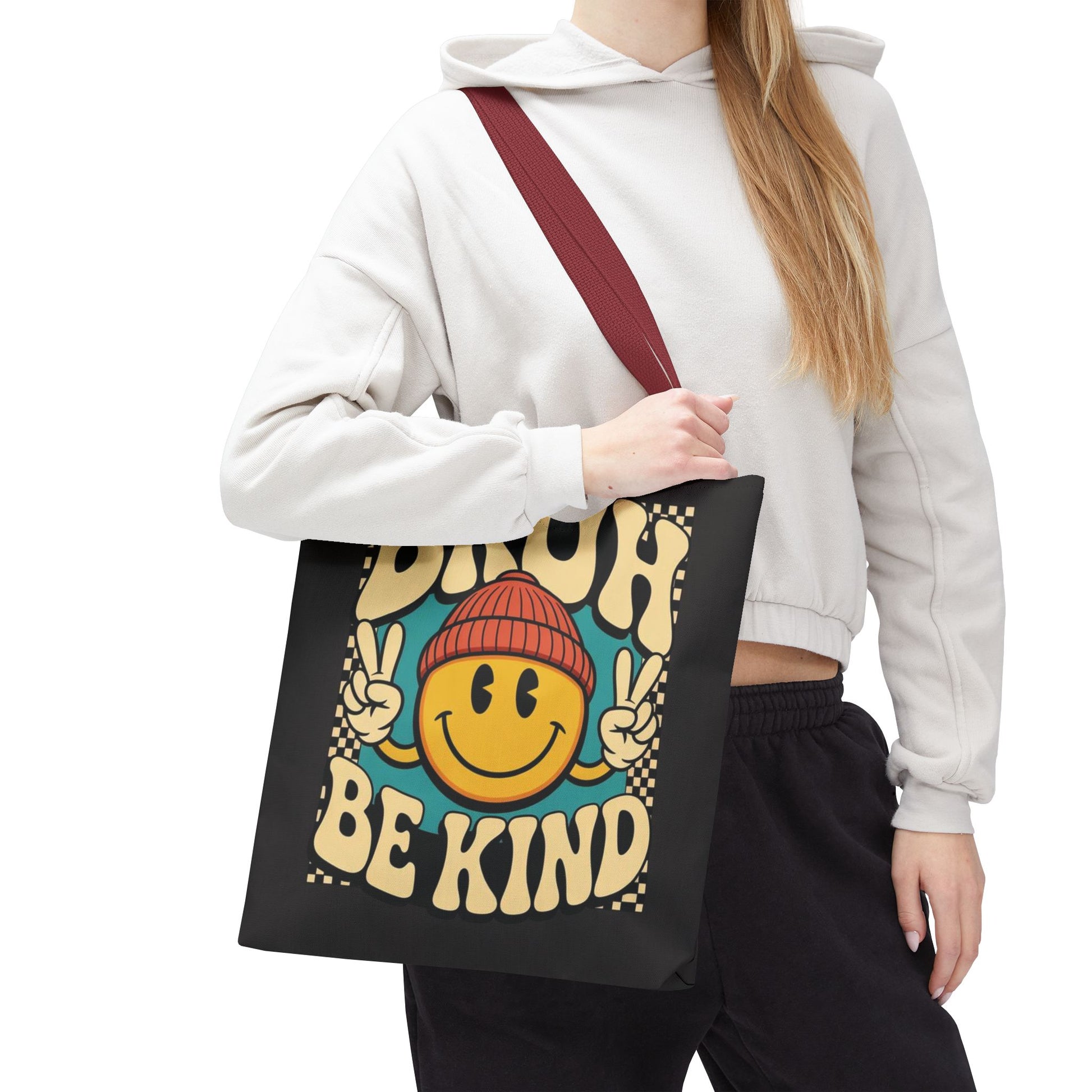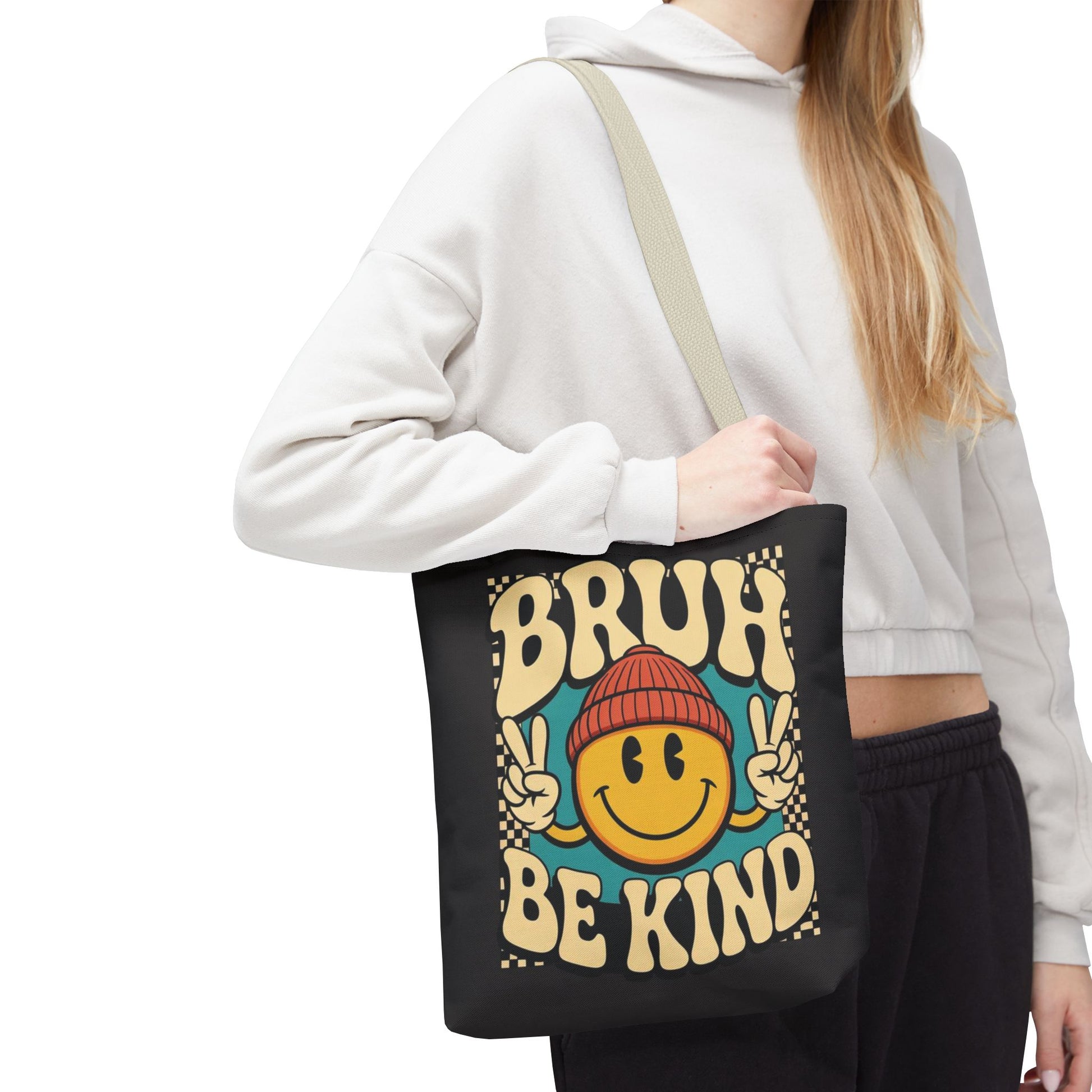 Bruh Be Kind Smiley Tote Bag — Retro Peace Sign Canvas Shopper
