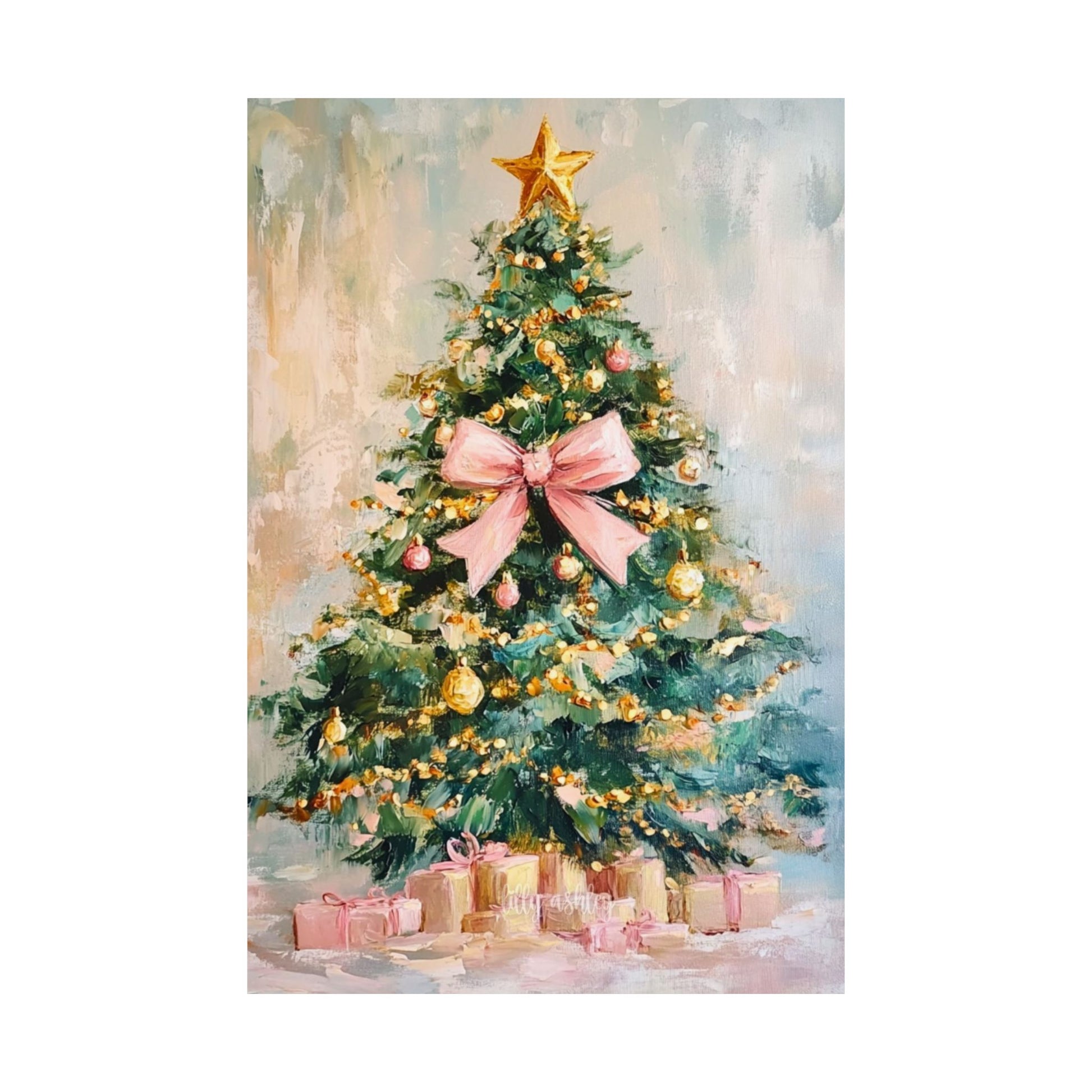 Soft brushstrokes and gentle light come together in this matte vertical poster to bring a cozy holiday scene into your home. A hand-painted Christmas tree stands at the center, its golden garlands and warm star glow balanced by a delicate pink bow and scattered presents. The muted matte finish keeps reflections low and lets the painterly texture show through, creating a calm, nostalgic atmosphere that invites quiet evenings with hot drinks and soft music.