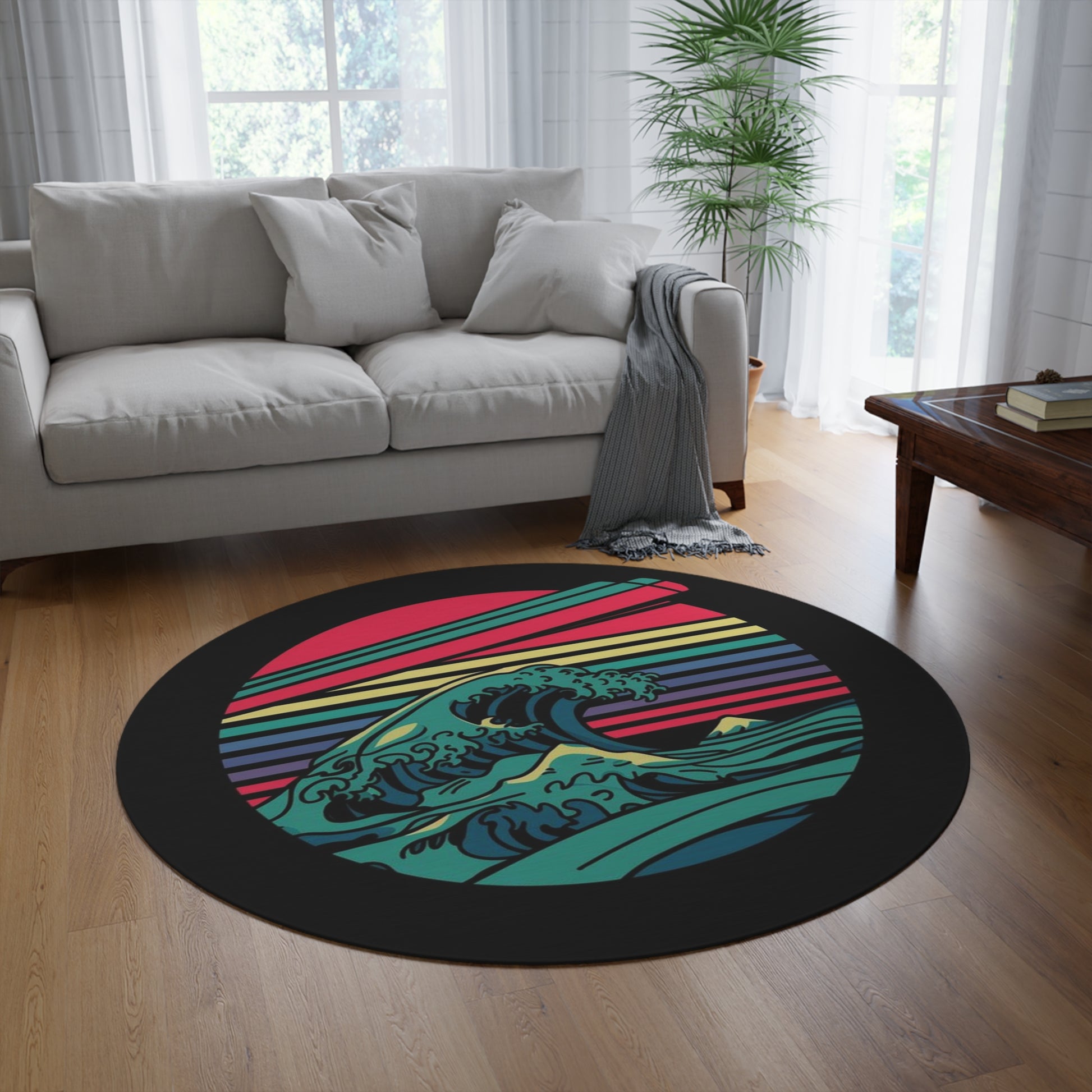 Retro Wave Ocean Round Rug — Vintage Sunset Great Wave Floor Mat