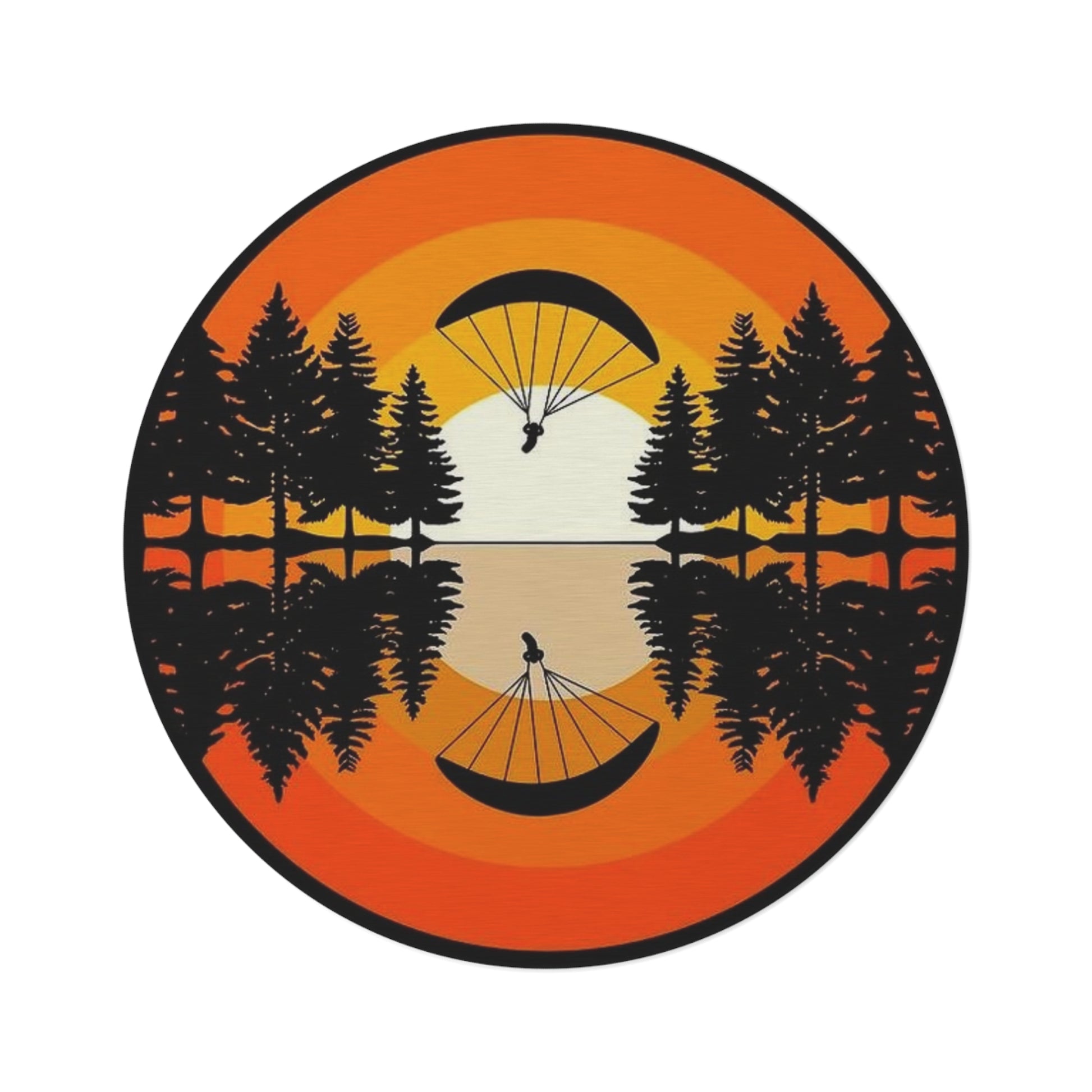 A round chenille rug that brings golden-hour calm to your floor. Warm bands of sunset orange and honey surround a mirrored lake scene: tall pine silhouettes and a lone parachute gliding down to the water, its reflection doubling the quiet moment. The plush, textured surface invites bare feet and slow mornings. Lay it beneath a reading nook, beside a cabin-style bed, or in a sunlit living room to anchor a nature-focused corner with retro warmth.